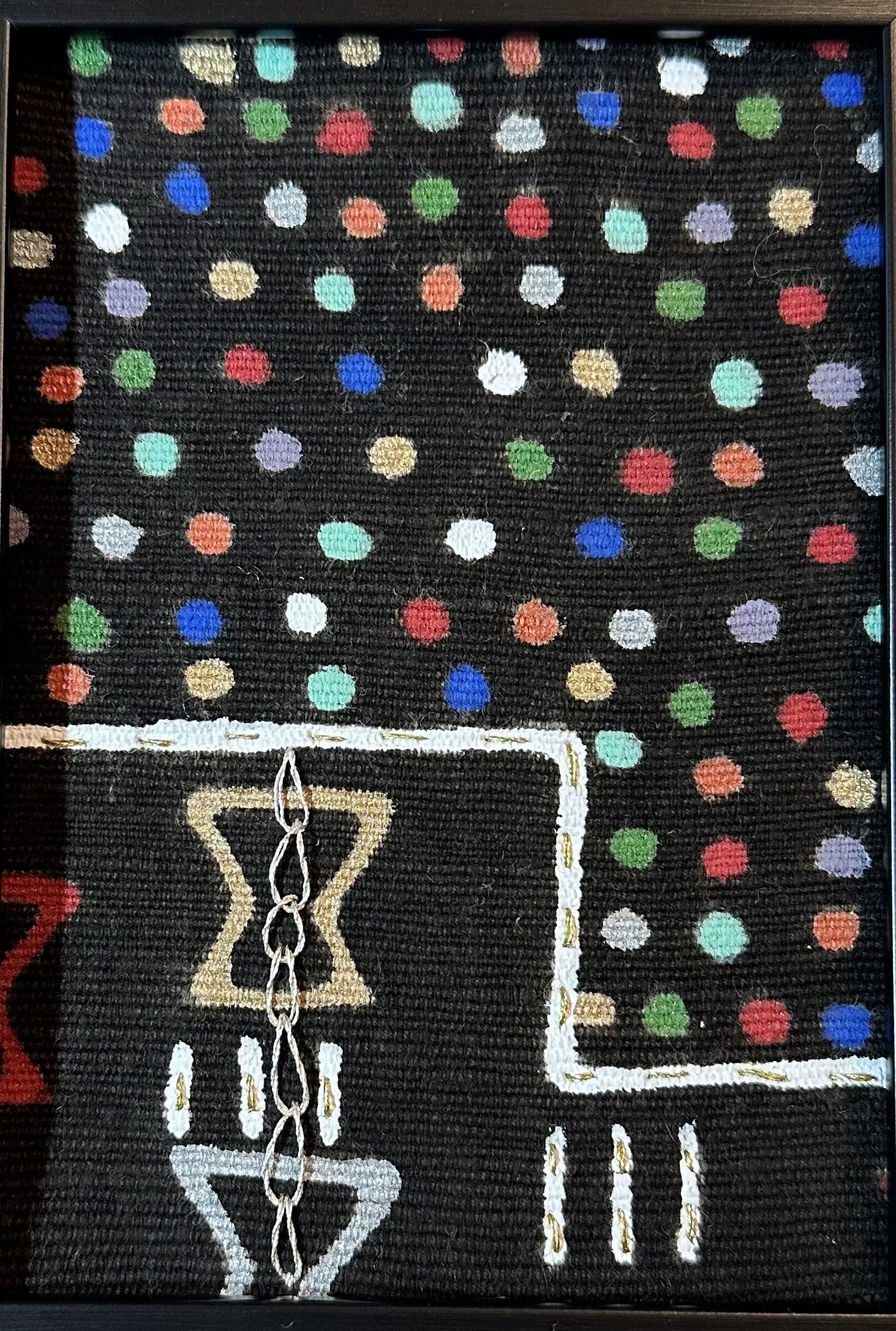 Archival ink on mud cloth with embroidery by Artist/author Dorothy Jett-Carter.