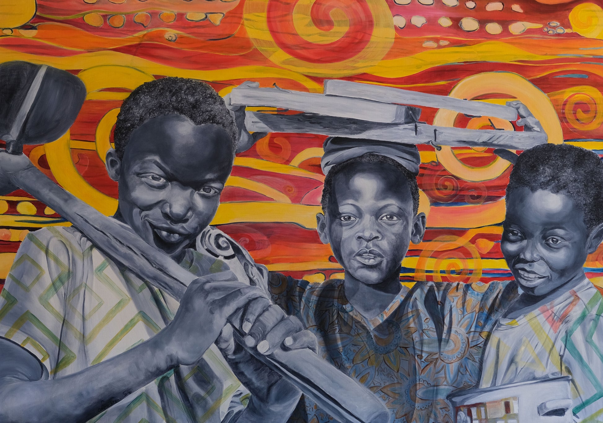 From the series: I Saw You, You See Me #5 The inspiration for this painting is three recently taken photos of three African boys who have to go to work every day. The left and middle boys carry tools, just like in the photo. The boy on the right holds an empty pan in his hands. Modern slavery or children's labor doesn't ensure these children they will have something to eat.